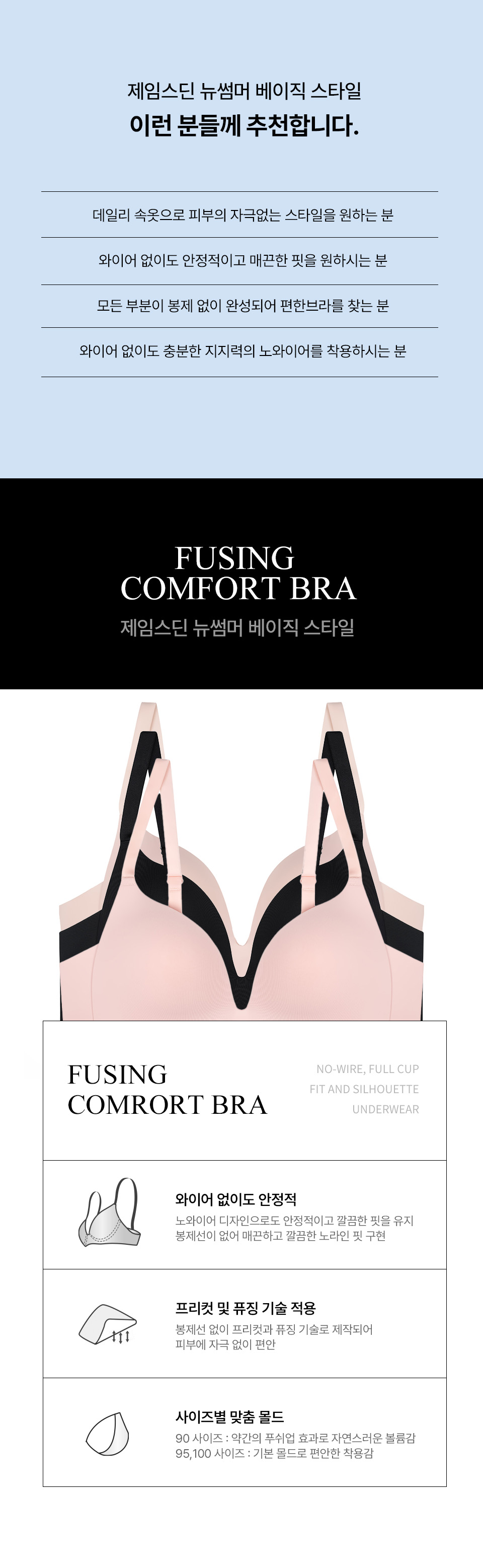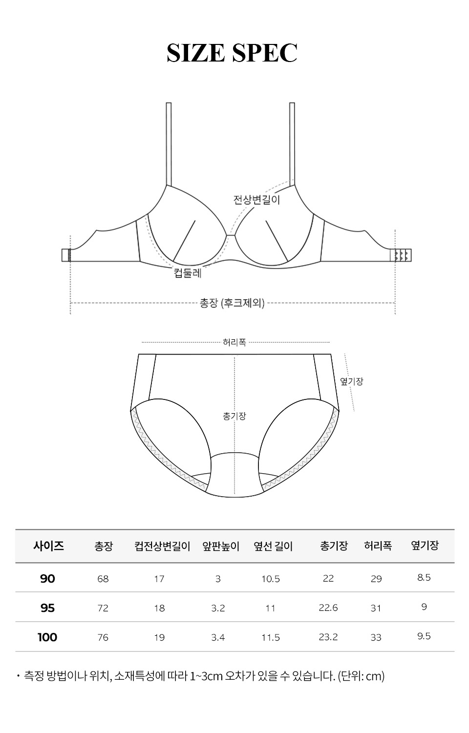 | 사이즈 | 총장 | 컵전상변길이 | 앞판높이 | 옆선길이 | 밑가슴둘레 | 윗가슴둘레 |