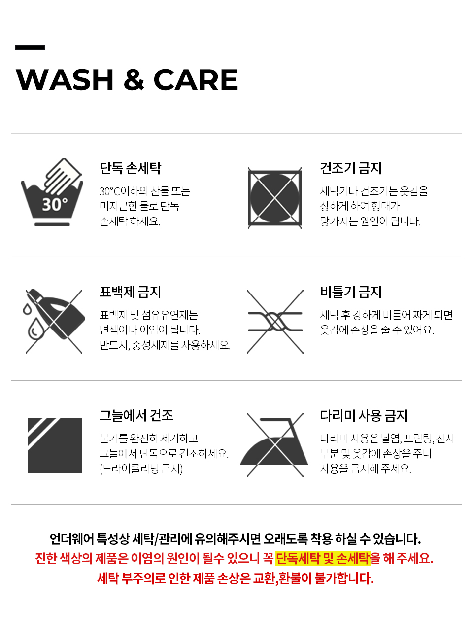 농색은 절대 분리 세탁하시고, 속옷은 반드시 손세탁 해주세요. (세탁기 사용시 세탁망에 넣어서 손세탁 기능으로 세탁, 건조기사용금지) |